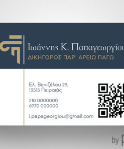 Επαγγελματική κάρτα δικηγόρου με κίονα σε μπλε & χρυσό χρώμα με QR code